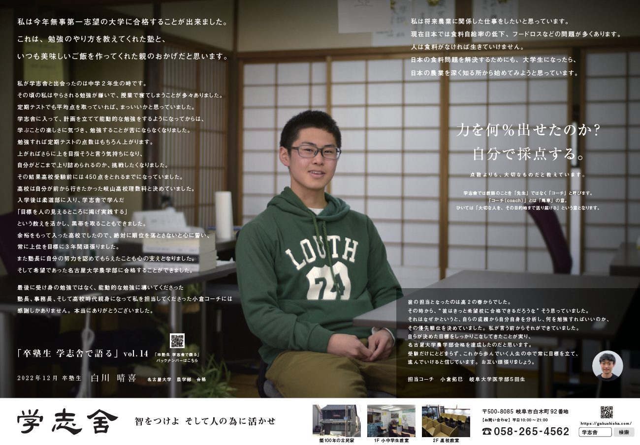 「卒塾生 学志舎で語る」シリーズのバックナンバーを公開しています。 「卒塾生 学志舎で語る」2023 vol.15 第15回は北海道大学 歯学部に合格した星谷 惺くんからのメッセージを掲載しました。 詳細はこちら 「卒塾生 学志舎で語る」2023 vol.14 第14回は名古屋大学 農学部に合格した白川 晴喜くんからのメッセージを掲載しました。 詳細はこちら 「卒塾生 学志舎で語る」2023 vol.13 第13回は名古屋市立大学 人文社会学部に合格した坂本 詩織さんからのメッセージを掲載しました。 詳細はこちら 「卒塾生 学志舎で語る」2022 vol.12 第12回は京都府立大学 生命環境学部 環境デザイン学科に進んだ立山 稜真さんからのメッセージを掲載しました。 詳細はこちら 「卒塾生 学志舎で語る」2022 vol.11 第11回は岐阜大学 大学院で自然科学技術研究科エネルギー専攻の山田悠貴さんからのメッセージを掲載しました。 詳細はこちら 「卒塾生 学志舎で語る」2022 vol.10 第10回は学志舎から金沢大学理工学域に進んだ山本創大さんからのメッセージを掲載しました。 詳細はこちら 「卒塾生 学志舎で語る」2022 vol.9 第9回は学志舎から同志社大学文化情報学部に合格した嶺川朋那さんからのメッセージを掲載しました。 詳細はこちら 「卒塾生 学志舎で語る」2022 vol.8 第8回は学志舎から大阪大学人間科学部に進学、現在はITエンジニアとして活躍中の川村紘大郎さんからのメッセージを掲載しました。 詳細はこちら 「卒塾生 学志舎で語る」2022 vol.7 第7回は学志舎から岐阜大学医学部に進学、現在は消化器外科医として活躍中の河合純兵さんからのメッセージを掲載しました。 詳細はこちら 「卒塾生 学志舎で語る」2021 vol.6 第6回は学志舎から岐阜薬科大学に進学した服部淳さんからのメッセージを掲載しました。 詳細はこちら 「卒塾生 学志舎で語る」2021 vol.5 第5回は学志舎から岐阜大学教育学部に進学、今春から岐阜大学 大学院教育学研究科に進学した杉山莉聖さんからのメッセージを掲載しました。 詳細はこちら 「卒塾生 学志舎で語る」2021 vol.4 第4回は学志舎から同志社大学 商学部に合格、卒業した鈴木寛明くんからのメッセージを掲載しました。 詳細はこちら 「卒塾生 学志舎で語る」2021 vol.3 第3回は学志舎から富山大学 医学部に合格、現在6年の山本大慈くんからのメッセージを掲載しました。 詳細はこちら 「卒塾生 学志舎で語る」2021 vol.2 第2回は学志舎から藤田医科大学 医療科学部に合格、卒業した高鳥成美さんからのメッセージを掲載しました。 詳細はこちら 「卒塾生 学志舎で語る」2021 vol.1 第1回は学志舎から東京大学理科Ⅰ類に合格、東大大学院を卒業した日下部達哉くんからのメッセージを掲載しました。 詳細はこちら